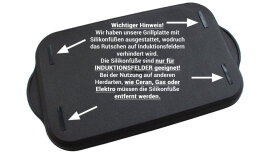 Durch die Rillenstruktur erhält Ihr Fleisch, Fisch oder Gemüse die typischen Grillstreifen, alles bleibt schön saftig und wichtige Nährstoffe bleiben erhalten. Die Grillplatte ist mit Silikonfüßen ausgestattet, wodurch das Rutschen auf dem Induktionskochfeld verhindert und Ihnen das Kochen mit unserer Grillplatte erleichtert wird. Wenn Sie die Grillplatte auf Ceran, Gas oder dem Elektro-Ofen verwenden möchten, entfernen Sie bitte die 4 Silikonfüße.