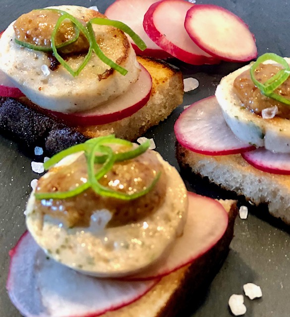 Drei Weißwurst Canapès mit Radieschen und süßen Senf garniert auf einem schwarzen Teller mit Salz angerichtet.