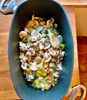- Zwiebeln, Champignons, Sellerie, Suppengrün, Kartoffeln und Knoblauch im Bräter anrösten, bis sie kräftig Farbe angenommen haben.