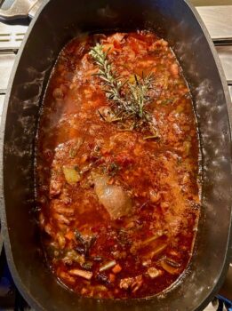 - Mit Rotwein ablöschen und einkochen lassen. Mit Fond/Brühe auffüllen. Lorbeerblatt zugeben.