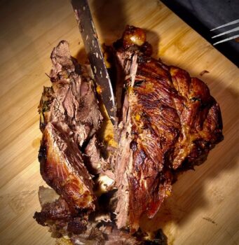 - Die geschmorte Lammkeule anschneiden – sie zerfällt förmlich vom Knochen…