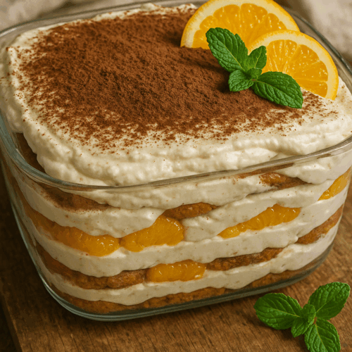 - Für mindesten 2 Stunden kalt stellen. Vor dem Verzehr mit Kakaopulver bestäuben und mit Orangenscheiben und Minze garnieren.Kakao zum bestäuben /Orangenscheiben und Minze zum garnieren
